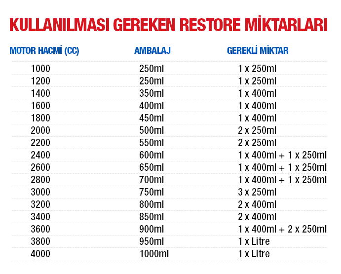 - Eski motor yağınıza Restore motor iç temizleyici ekleyip 15 dk rölantide çalıştırıp, yağı komple boşaltın.